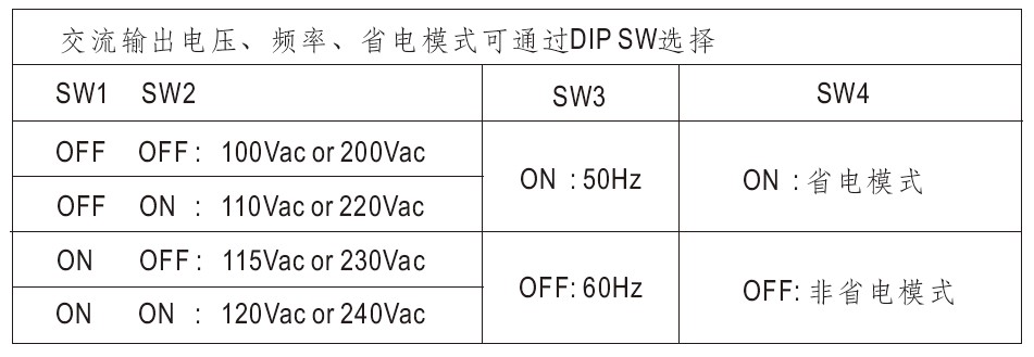 透過指撥開關(guān)設(shè)定輸出電壓、頻率與省電模式,指撥開關(guān)設(shè)定選擇請參閱表1,省電模式于極輕負(fù)載狀態(tài)下關(guān)閉輸出電源,以減低電池?fù)p耗,如醫(yī)療相關(guān)等緊急電源應(yīng)用,建議采用非省電模式,以確保系統(tǒng)可持續(xù)工作。出廠設(shè)定為110Vac/60Hz或230Vac/50Hz,以及非省電模式。