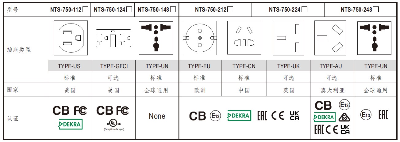 表2顯示不同的AC輸出插座以及相對應(yīng)的合適國家與認(rèn)證;使用者可以根據(jù)其需求選擇合適的型號。
