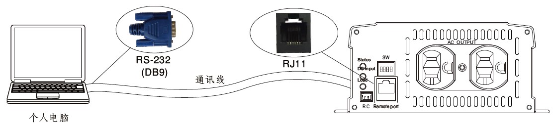 如圖2所示,可透過RS-232/RJ11的傳輸線連接PC與逆變器,讀取逆變器的內(nèi)部數(shù)據(jù)。