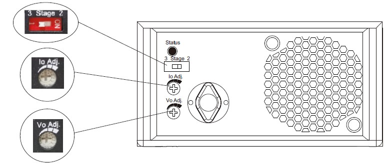 如圖3與圖4所示,可透過指撥開關(guān)設(shè)定2或3段充電曲線,出廠設(shè)定為3段。另外也可透過Vo Adj調(diào)設(shè)充電電壓,Io Adj調(diào)設(shè)充電電流。