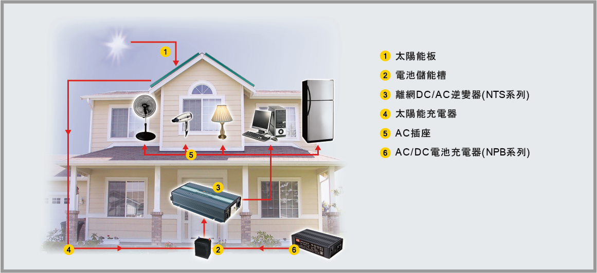 如圖5所示,應(yīng)用于家用智能供電系統(tǒng)為例,當(dāng)市電供電正常時,所有家用電器使用市電運轉(zhuǎn),同時NPB充電器可對儲能蓄電池充電;一旦出現(xiàn)短暫停電狀況,儲能蓄電池與NTS-1200可轉(zhuǎn)換產(chǎn)生交流電,在一定時間內(nèi)維持家用電器運轉(zhuǎn)。若房屋搭配太陽能板,這套供電系統(tǒng)白天可透過屋頂?shù)奶柲馨鍖⑻柲苻D(zhuǎn)換為直流電,用于對儲能蓄電池充電并同時透過NTS逆變器轉(zhuǎn)換的交流電滿足部分家用電器用電。在夜間失去太陽能來源后,儲能蓄電池可透過逆變器轉(zhuǎn)換交流電以滿足家用電器夜間使用,整套智能供電系統(tǒng)既節(jié)能又環(huán)保。