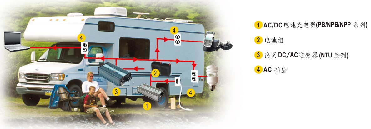 如圖7所示,以NPB-360+電池組+NTU-1200配置于露營車上并配置有AC輸入插頭,AC輸入插頭可進(jìn)行AC 直接供電(bypass)與提供充電器電源對電池充電,當(dāng)露營車停在有設(shè)置AC插座的營地,用戶可以直接把露營車AC插頭插上,此時露營車上連接NTU-1200輸出的設(shè)備電力會由市電供電;當(dāng)露營車開到?jīng)]有AC插座的營地或是車輛移動中,則露營車上的設(shè)備電力轉(zhuǎn)由電池與NTU-1200轉(zhuǎn)換提供。