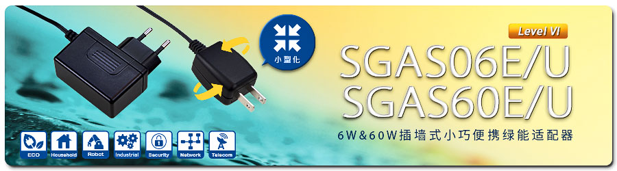 繼SGAS15系列上市后,明緯隨即推出6W/60W插墻式小巧便攜Level VI綠能適配器SGAS06/60系列。此二系列最大亮點是節(jié)能、小巧、便攜、不占位,并以工業(yè)級高質(zhì)量耐用理念設(shè)計,不僅可于-20~+70℃極寒或高溫下使用、并嚴選零件提供3年保固、DC輸出不慎短路/過載/過溫多重保護功能。安全、好用、耐用,適用于各式各樣之消費性電子產(chǎn)品、通訊、辦公、商用、工業(yè)儀器或需要符合最新能耗標準之各類設(shè)備。