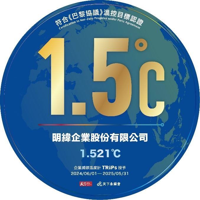 「企業(yè)減碳溫度計」(Temperature Rising Index for Pathways, TRIPs)由天下雜志與東海大學企業(yè)永續(xù)影響力中心共同發(fā)布,采用聯(lián)合國政府間氣候變化專門委員會(IPCC)發(fā)布之地球升溫情境,將全球升溫潛勢模型(Absolute Global Temperature Potential, AGTP)應用在企業(yè)的溫度評分。以企業(yè)自定義的減碳與凈零目標,仿真升溫數據,即為企業(yè)未來減排路徑的溫度。明緯經此模型推算溫度評級為1.521°C,符合于巴黎協(xié)議升溫1.5°C控制目標,更遠低于臺灣制造業(yè)2.79°C的平均溫度評級。