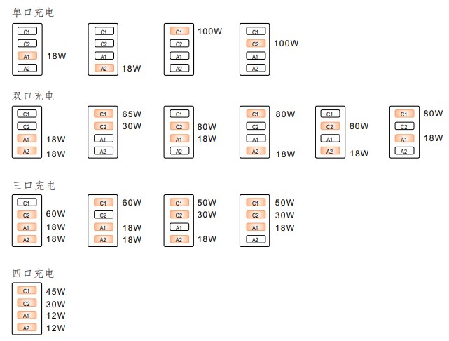 支持 PD(Power Delivery) 3.0 和 QC (Quick Charge)2.0、3.0 等主流快充協(xié)議,可滿足包括筆記本電腦、平板計算機、智能手機等多種設(shè)備的高效充電需求。下圖詳細說明了不同數(shù)量接口充電時各接口支持的最大功率: